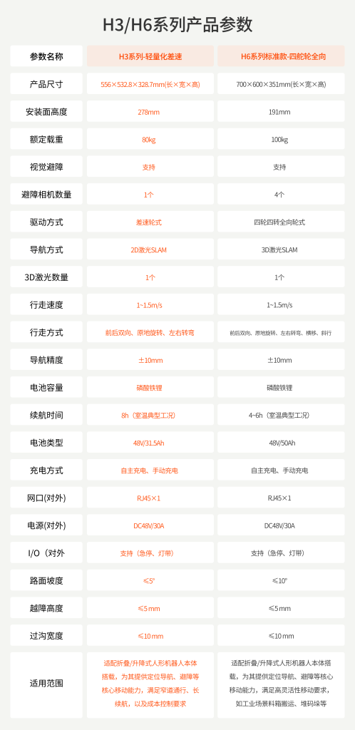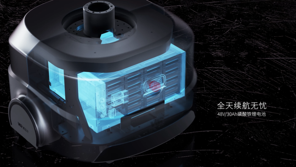 具备自主定位导航、3D视觉避障、高续航磷酸铁锂电池,为上装提供开放的软硬件接口。